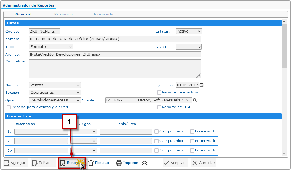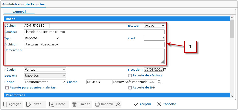 1. En la sección de datos: Debemos indicar el código, nombre y archivo del nuevo reporte.