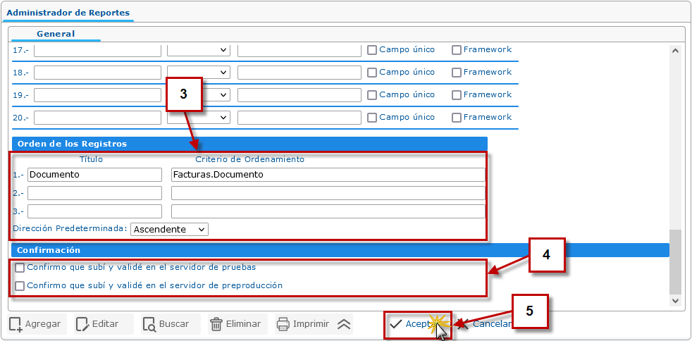 3. En la sección de Orden de los Registros: Podemos indicar 3 tipos de ordenamiento que el usuario podrá seleccionar para generar el reporte.