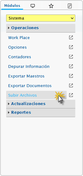 a. Despues de terminar de modificar los archivos del nuevo reporte, debemos ingresar en el sistema, seleccionar el módulo Sistema y al desplegar la sección de Operaciones seleccionaremos la opción de Subir Archivos.