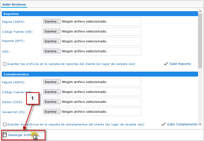 b. Luego de haber seleccionado la opción de Subir Archivos se muestra la pantalla donde debemos subir los 4 archivos (aspx, vb, rpt y xsd) en la sección Reportes y