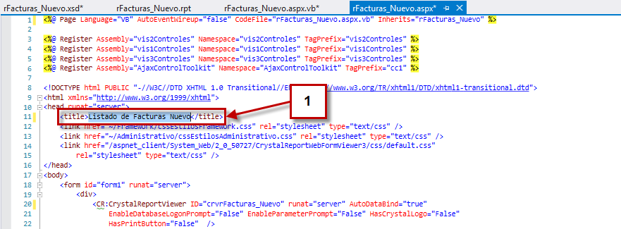 1. En el archivo .aspx: Este es el archivo que conecta la petición del usuario con la generación del reporte, en este archivo solo debemos editar el título del reporte.