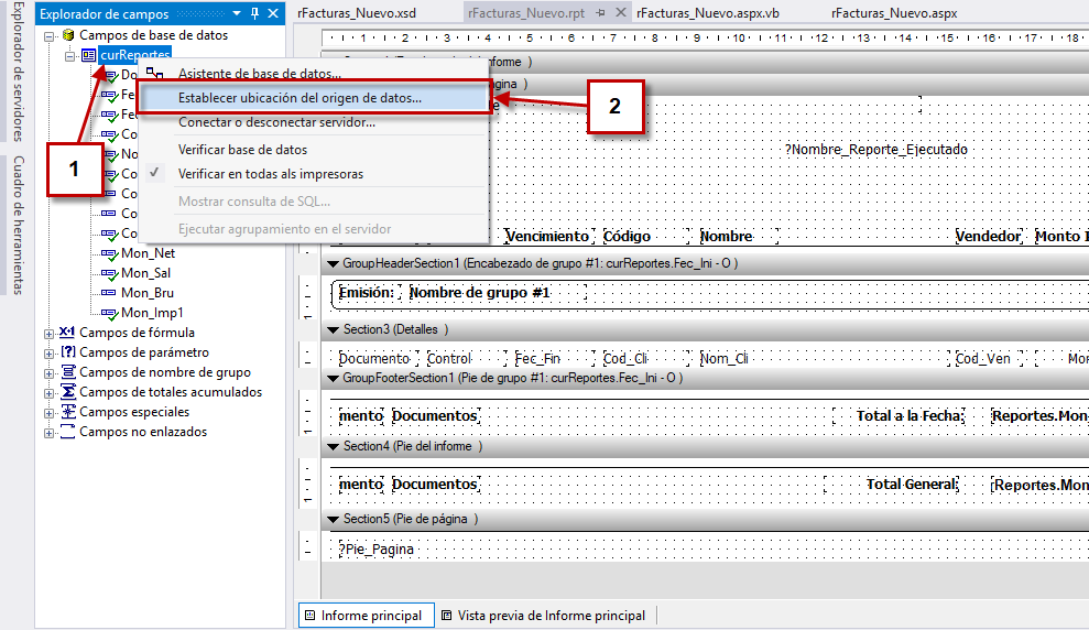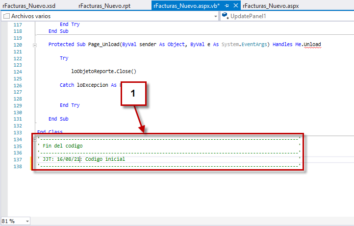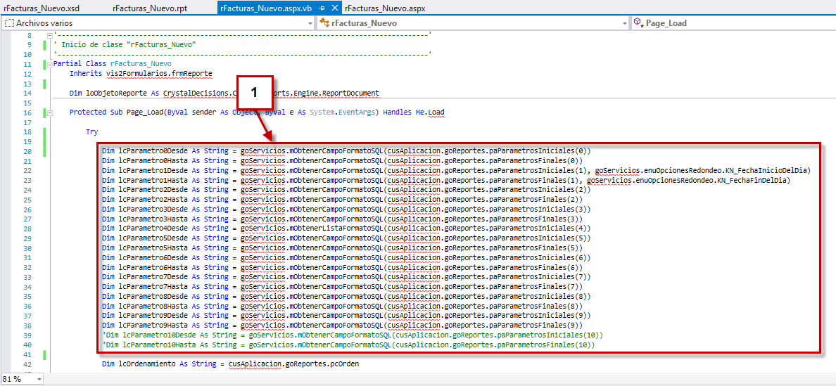 2. En el archivo .aspx.vb: Este es el archivo que recibe los parámetros (Filtros) del reporte y se encarga de hacer la consulta a Base de Datos, en este archivo debemos editar:
