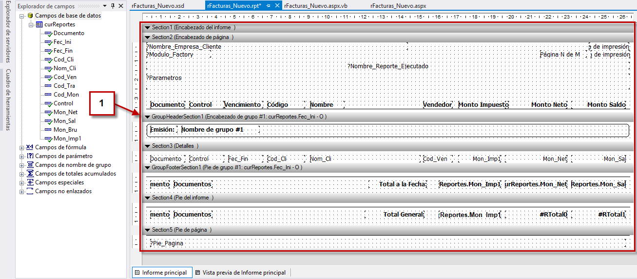 4. En el archivo .rpt: Este es el archivo en el que se define la parte visual del reporte. En este archivo puede configurar como quiere que se presente la información en el reporte.