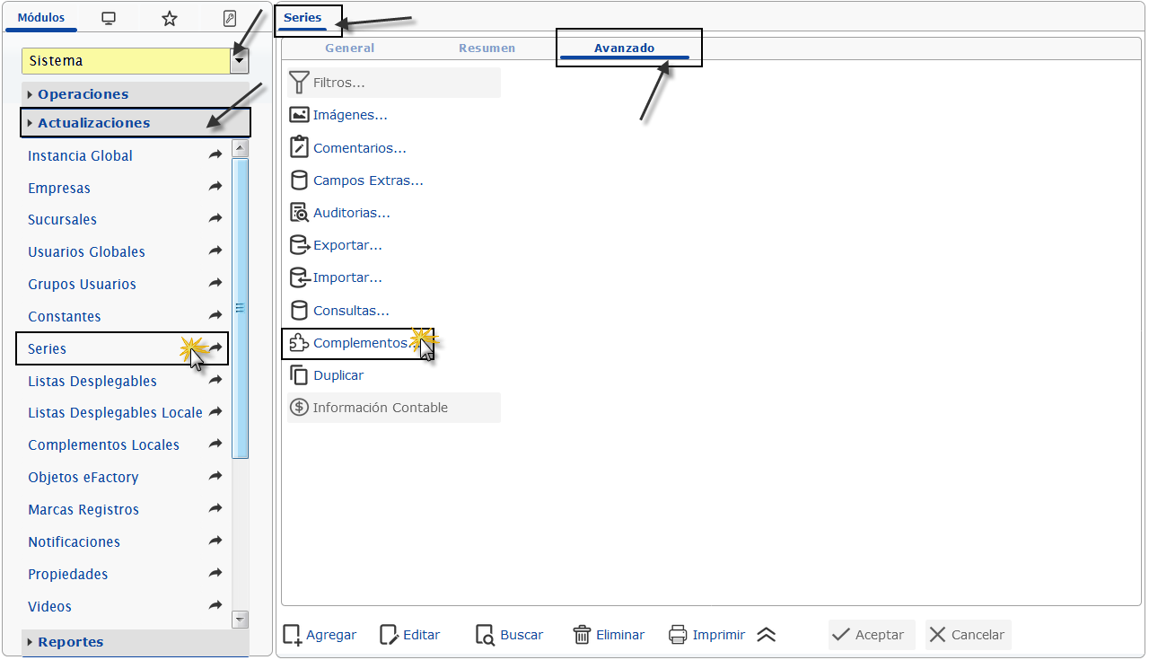 Luego en el módulo Sistema, desplegamos el componente Actualizaciones y activamos el sub componente Empresas.