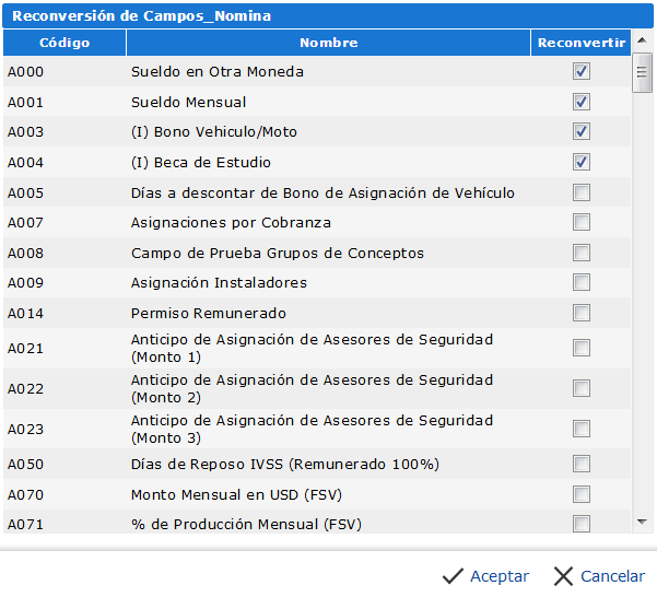 Aplicar Reconversión Nómina, se nos muestra elementos donde debemos marcar los campos relacionados