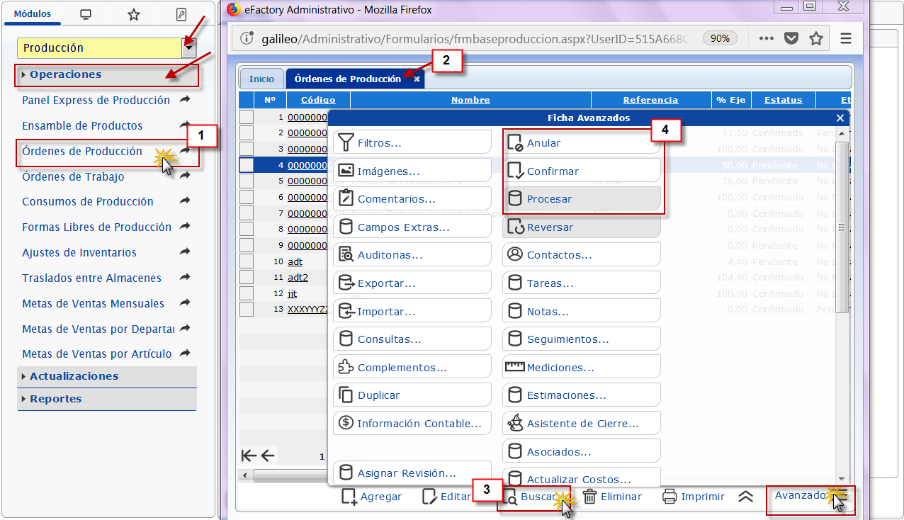 el sub componente de Órdenes de Producción, luego procedemos a presionar el botón