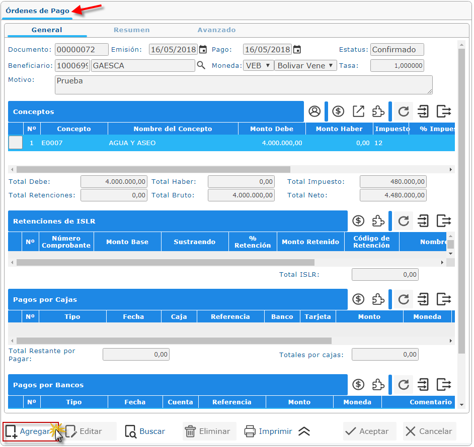 datos en la pantalla Órdenes de Pago por Gastos y procedemos a seleccionar el boton de