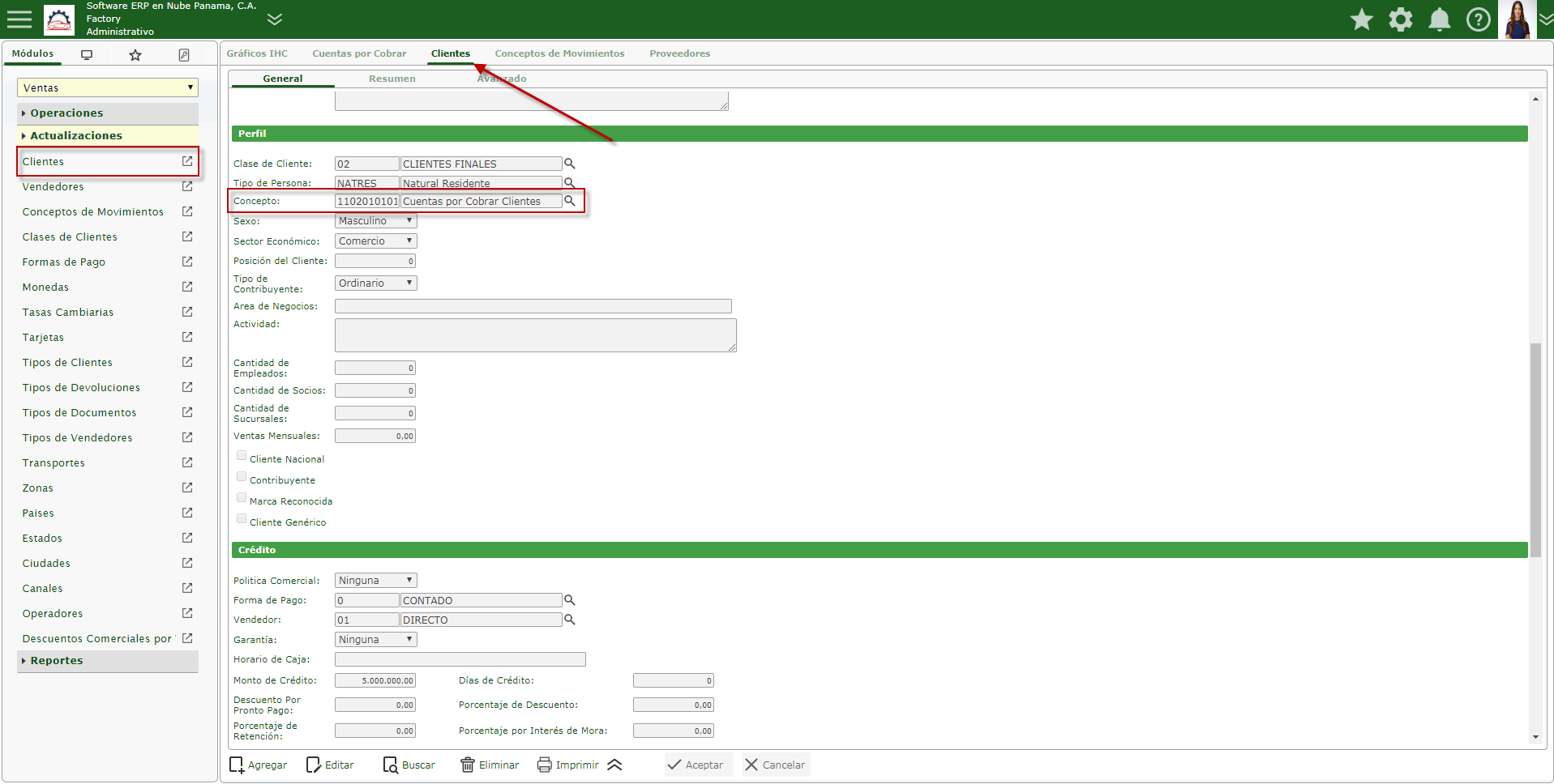 b. Después seleccionaremos el módulo Ventas, desplegamos el componente Reportes y activamos el sub componente Cuentas por Cobrar.