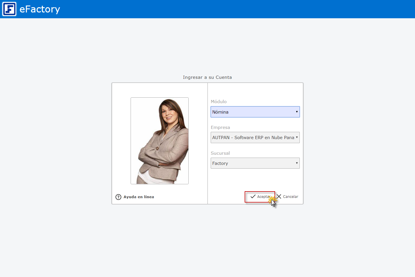 a. Para ingresar debemos iniciar en eFactory con nuestro Usuario, Contraseña, y seleccionaremos el botón