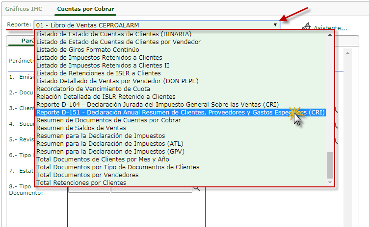 a. Se muestra la ventana de Reportes de Cuentas por Cobrar y nos ubicamos en la parte superior en el campo Reporte y se desplegara un panel en el cual debemos seleccionar Reporte D-151 Declaración Anual Resumen de Clientes, Proveedores y Gastos Específicos (CRI).