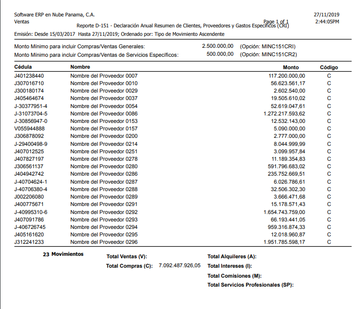 se muestra el Reporte D-151 Declaración Anual Resumen de Clientes, Proveedores y Gastos Específicos (CRI).