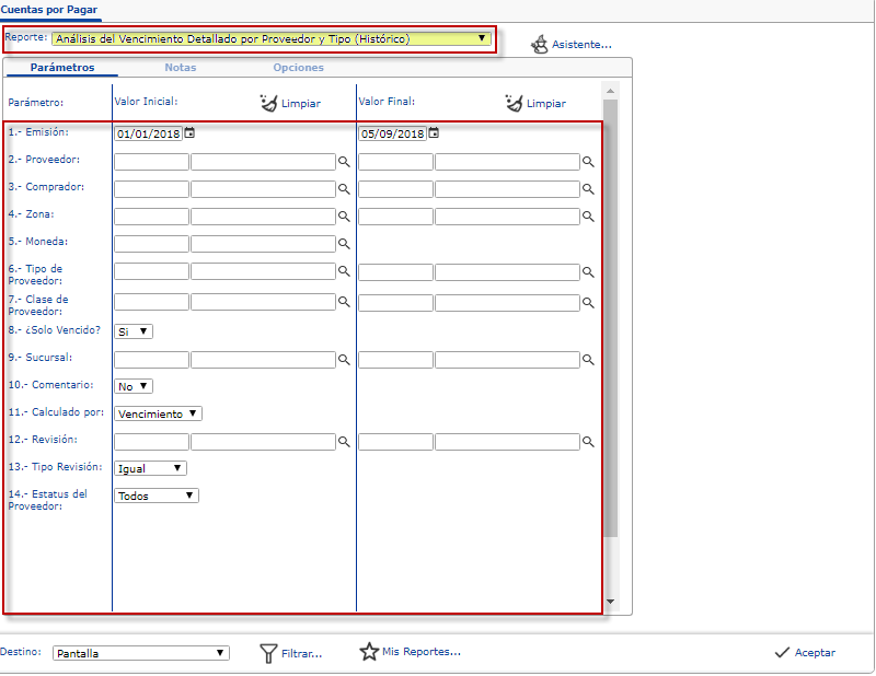 Análisis del Vencimiento detallado por Proveedor y Tipo (Histórico), especificamos los parámetros necesarios y presionamos el botón