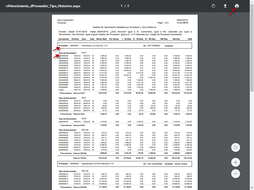 b. Luego de aceptar los parámetros, se muestra en pantalla el Análisis del Vencimiento, en el cual los datos se muestran agrupados por Proveedor y por Tipo; aquí debemos verificar la información y procedemos a guardarlo como un documento PDF o bien imprimirlo