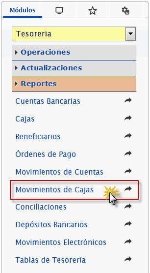 b. En el módulo Tesorería, desplegamos el componente Reportes y activamos el sub componente Movimientos de Cajas