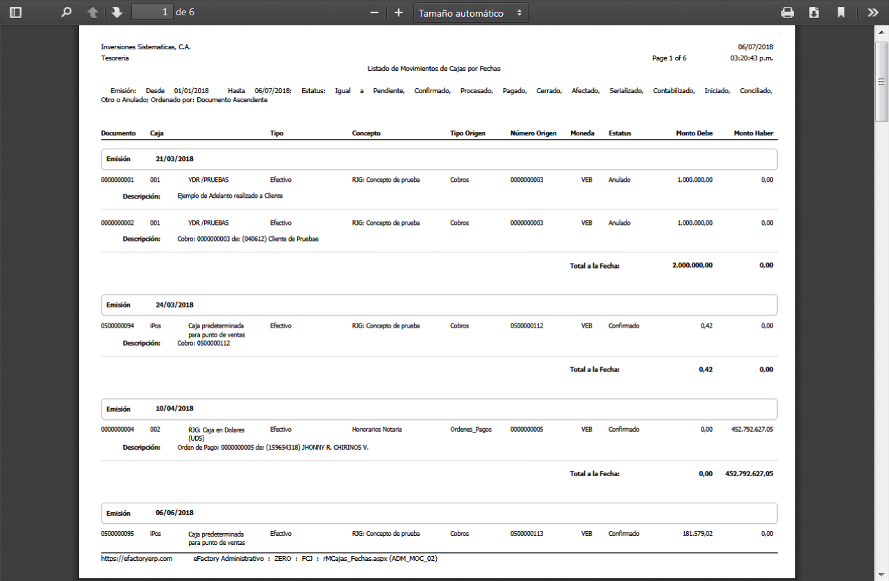 b. Luego de aceptar los parámetros, se muestra en pantalla el Listado de Movimientos de Cajas por Fechas, el cual debemos verificar y procedemos a guardarlo como un documento PDF o bien imprimirlo