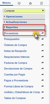 b. En el módulo Compras, desplegamos el componente Reportes, activamos el sub componente Proveedores.