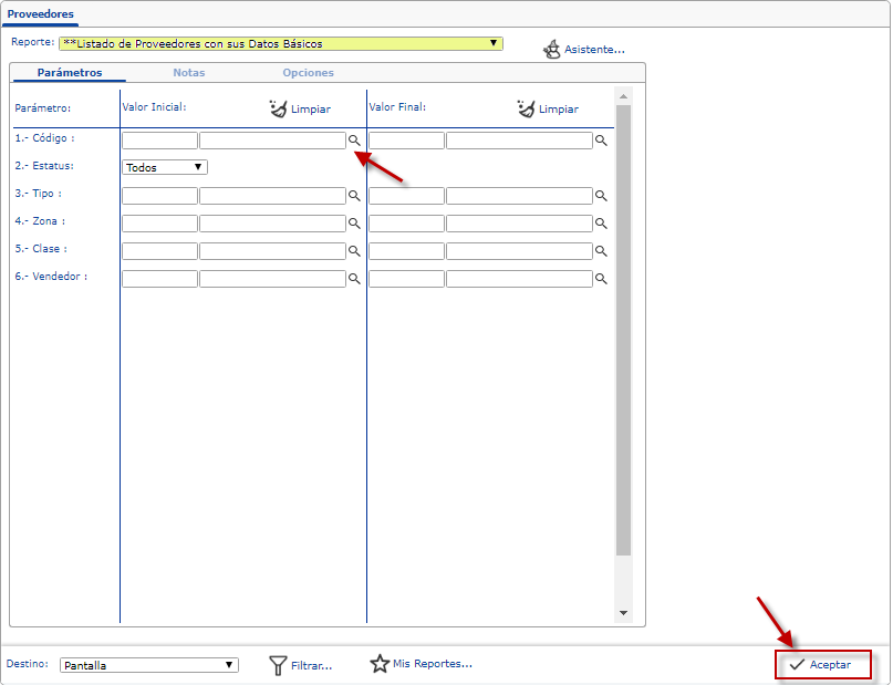 Listado de Proveedores con sus Datos Básicos, si requerimos filtrar el informe, especificamos los parámetros necesarios como Estatus, Tipo, Zona, Vendedor, entre otros.
