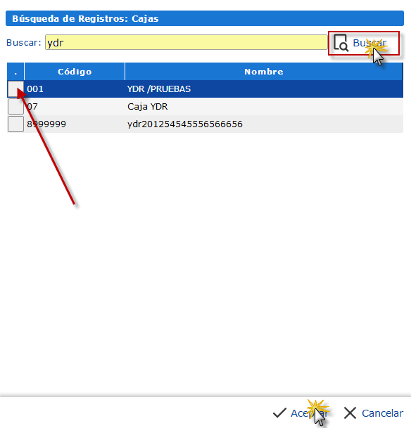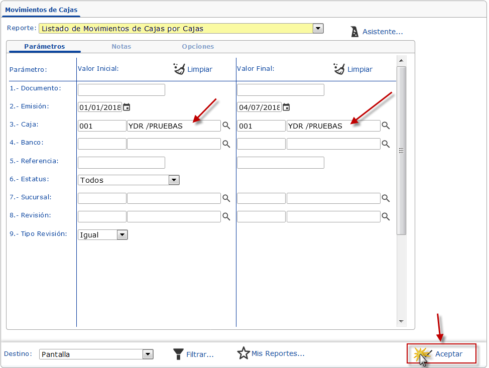 Listado de Movimientos de Cajas por Cajas, especificamos los parámetros necesarios y presionamos el botón