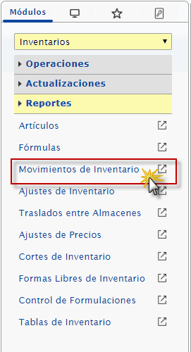 b. En el módulo Inventarios, desplegamos el componente Reportes, activamos el sub componente Movimientos de Inventario.