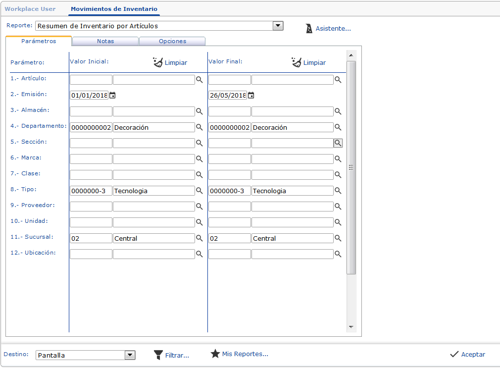 Resumen de Inventario por Artículos, especificamos los parámetros necesarios y presionamos el botón