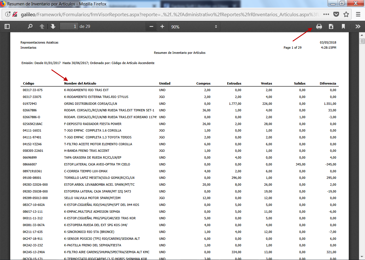 b. Luego de aceptar los parámetros, se muestra en pantalla el Reporte Resumen de Inventario por Artículos, en el cual vemos un listado con todas las entradas y salidas en los Inventarios especificados; aquí debemos verificar la información y procedemos a imprimir el documento o guardarlo como pdf.