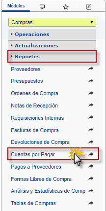 b. En el módulo Compras, desplegamos el componente Reportes, activamos el sub componente Cuentas por Pagar.