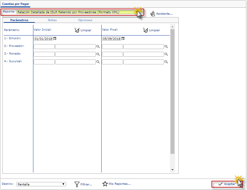 Relación Detallada de ISLR Retenido por Proveedores (Formato XML), si requerimos filtrar el informe, especificamos los parámetros necesarios como Fecha de Emisión, Proveedor, Moneda y Sucursal.