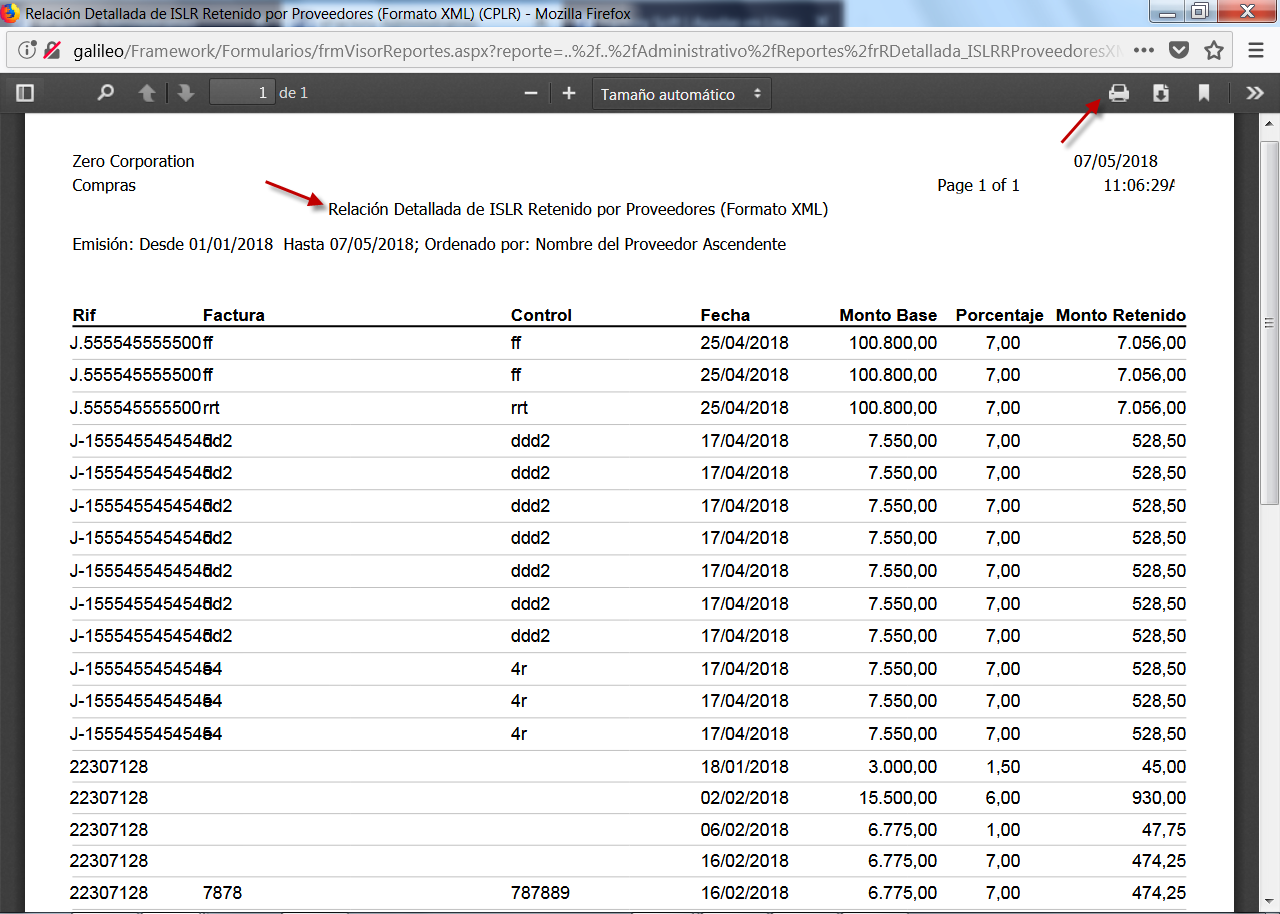 b. Luego de aceptar los Parámetros, se muestra en pantalla la Relación de Detallada de ISLR Retenido por Proveedores, aquí debemos verificar la información y procedemos a guardar el documento como pdf o bien imprimirlo.
