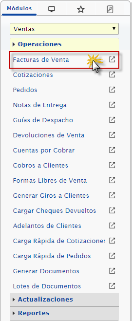 b. Después ubicaremos el módulo ventas, desplegamos el componente Operaciones y activamos el sub. componente Facturas de Ventas.