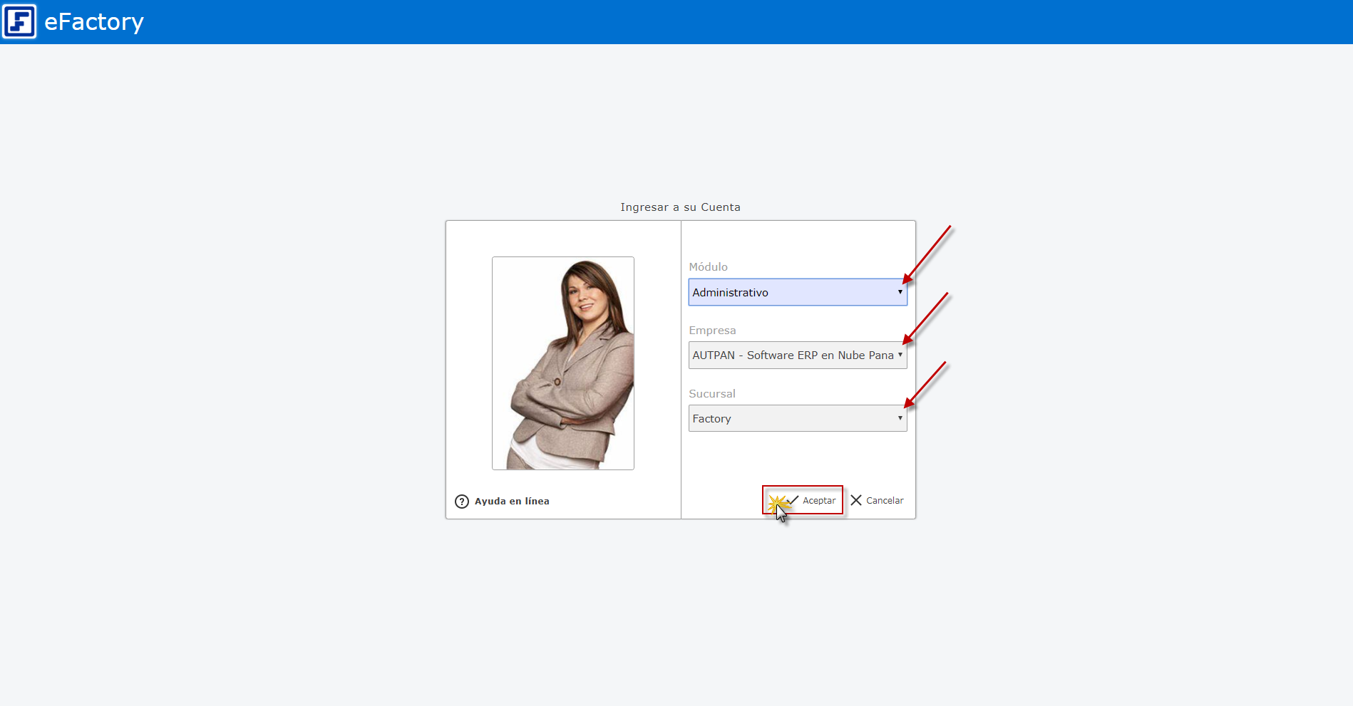 a. Para ingresar debemos iniciar en eFactory con nuestro Usuario, Contraseña, y seleccionaremos el botón