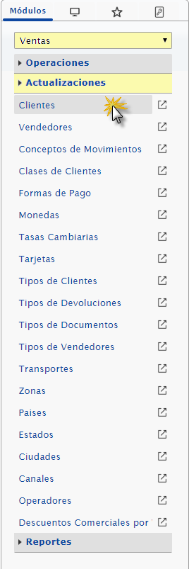 b. Luego seleccionaremos el módulo Administrativo, desplegamos el componente Actualizaciones y activamos el sub componente Clientes.
