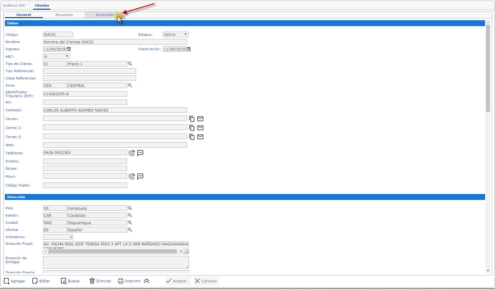 a. Al haber seleccionado el sub. componente Clientes, se muestra la pantalla donde nos ubicamos en la parte superior y seleccionaremos la ficha Avanzado.