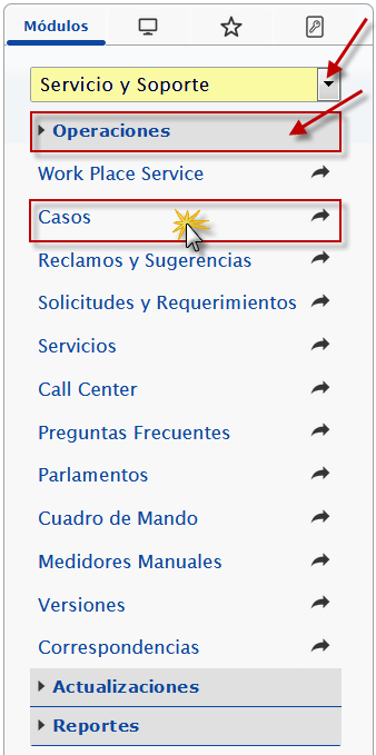 b. En el módulo Servicio y Soporte, desplegamos el componente Operaciones y activamos el sub componente Casos.