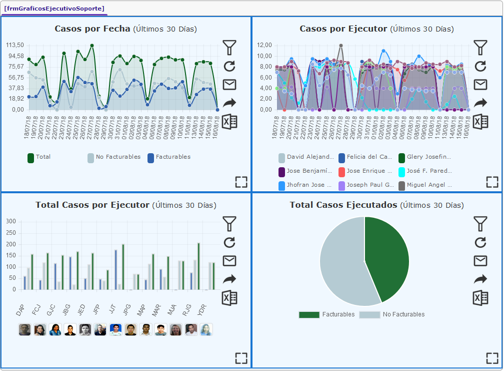 b. En cada sub gráfico, tenemos en su parte inferior, una leyenda, indicando las categorías de agrupación de los datos mostrados, excepto para el sub gráfico Total de Casos por Ejecutor, en donde se observa una foto por cada ejecutor en el eje horizontal del mismo (ver paso 2b).