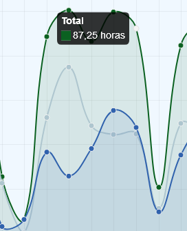 En el ejemplo, se observa el total de horas correspondiste a un día en particular al pasar el puntero sobre un punto en el sub gráfico de Casos por Fecha.