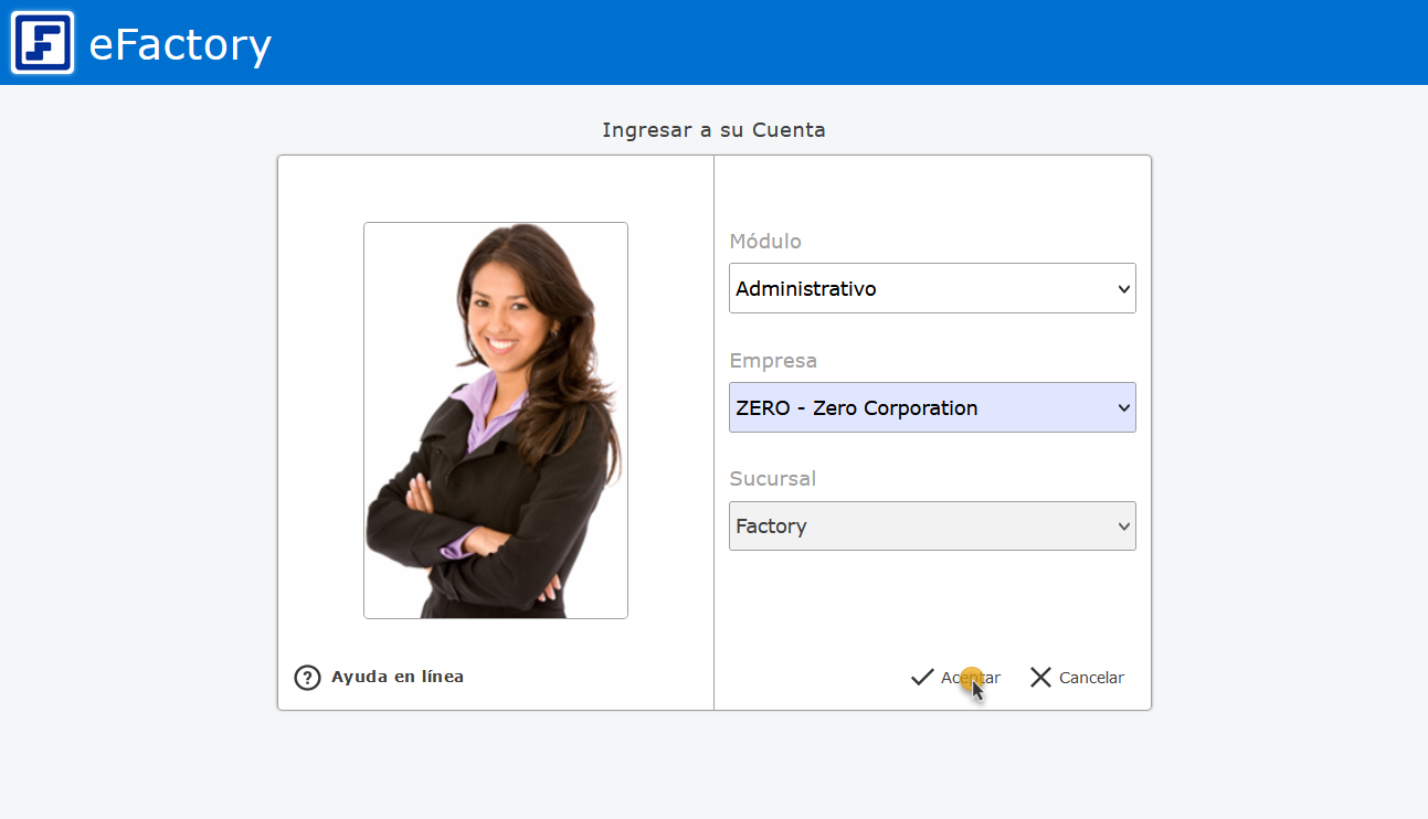 Primero debemos ingresar al sistema de eFactory colocando nuestro usuario y contraseña en la pantalla inicial de eFactory, luego presionaremos el botón de