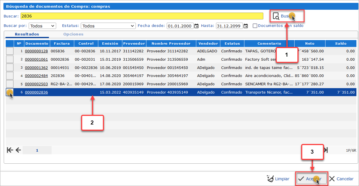 se abrirá la pantalla de Búsqueda: Compras, en esta debemos buscar y seleccionar la factura