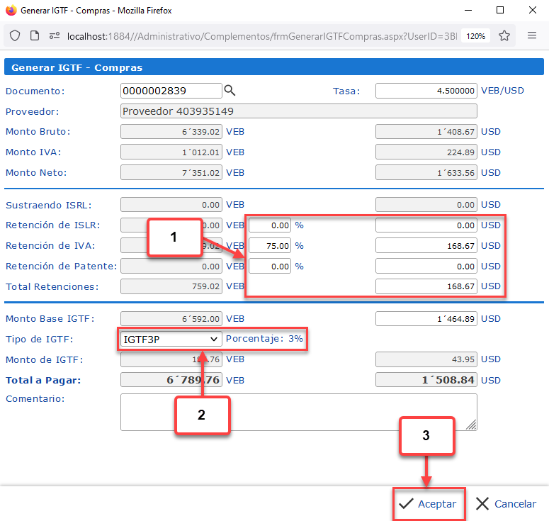 c. Opcionalmente podemos modificar la Tasa con la que se calculan los montos en la otra moneda. Esta tasa se registrará también en la Cuenta por Pagar de IGTF.