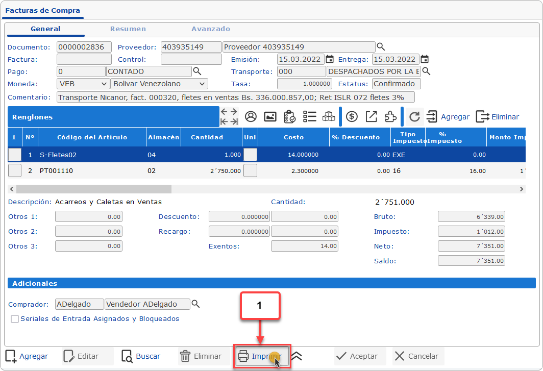 a. Despues de generar el IGTF de la factura, podemos imprimir el Formato de Compra que mostrará el IGTF aplicado. Para esto debemos hacer clic en el botón