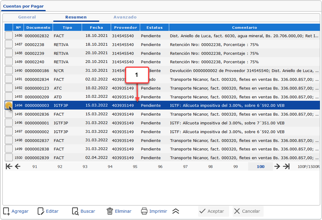 b. Una vez se muestre el formulario de Cuentas por Pagar, debemos buscar y seleccionar la Cuenta por Pagar de IGTF. Para esto vamos a hacer clic en la pestaña Resumen.