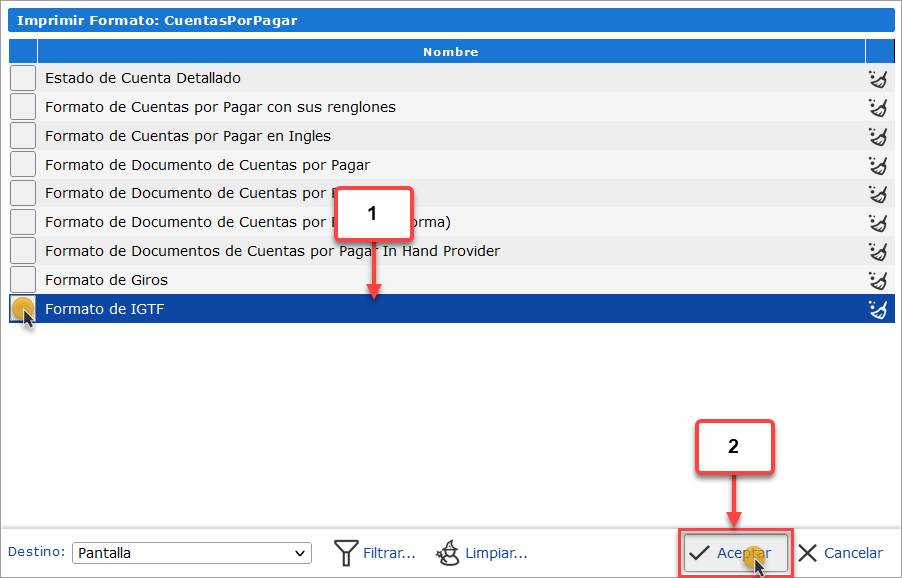 e. Una vez se muestre el listado de formatos de Cuentas por Pagar, debemos seleccionar el formato Formato de IGTF y luego presionar el botón