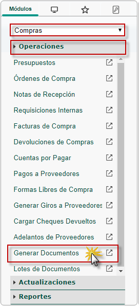 b. En el módulo Compras, desplegamos el componente Operaciones y activamos el sub. componente Generar Documentos.