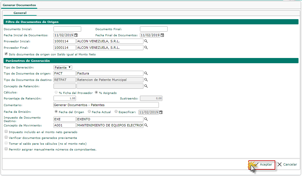 Generar Retenciones de Patente a todas las facturas encontrada por los filtors seleccionado.