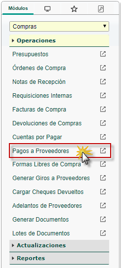 b. En el módulo Compras, desplegamos el componente Operaciones y activamos el sub. componente Pagos a Proveedores.
