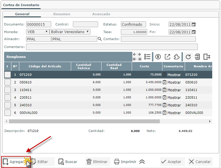 c. Después de haber llenando los campo del Cortes de Inventario procedemos a seleccionar el ícono