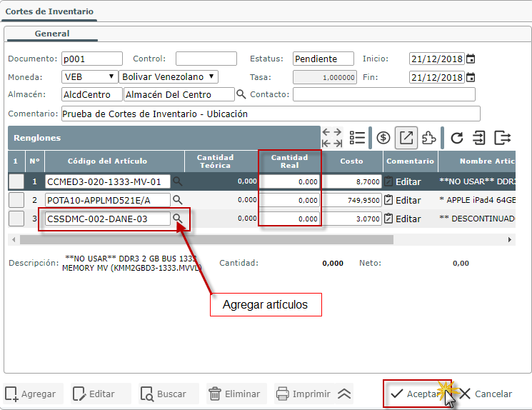 c. Luego se observa el Cortes del Inventario con la Cantidad Real actualizada, después de haber realizado el conteo de existencias por múltiples ubicaciones.