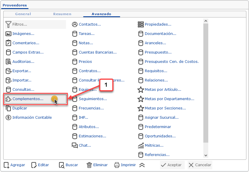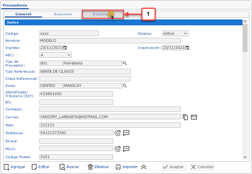 a. Luego de haber seleccionado la opción de Proveedores se muestra la pantalla donde haremos clic en la pestaña Avanzado.