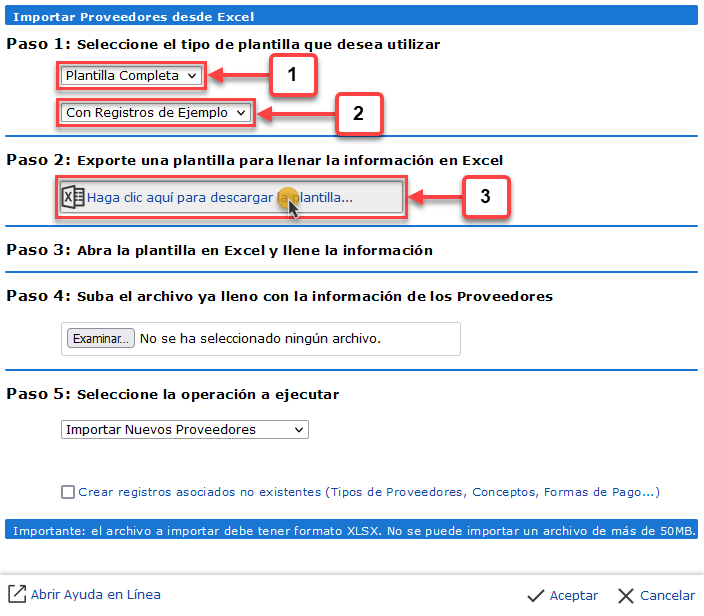 Al presionar el botón Haga clic aquí para descargar la plantilla... se descargará la plantilla Excel, la cual debe llenar con los Proveedores que desea importar o actualizar.