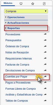 b. En el módulo Compras, desplegamos el componente Reportes y activamos el sub componente Cuentas por Pagar