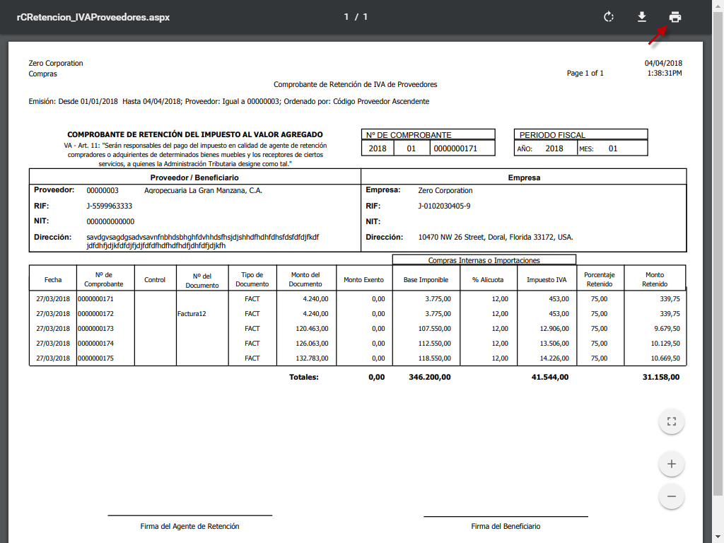 b. Luego de aceptar los parámetros, se muestra en pantalla el Comprobante de Retención de IVA, el cual debemos verificar y procedemos a guardarlo como un documento PDF o bien imprimirlo
